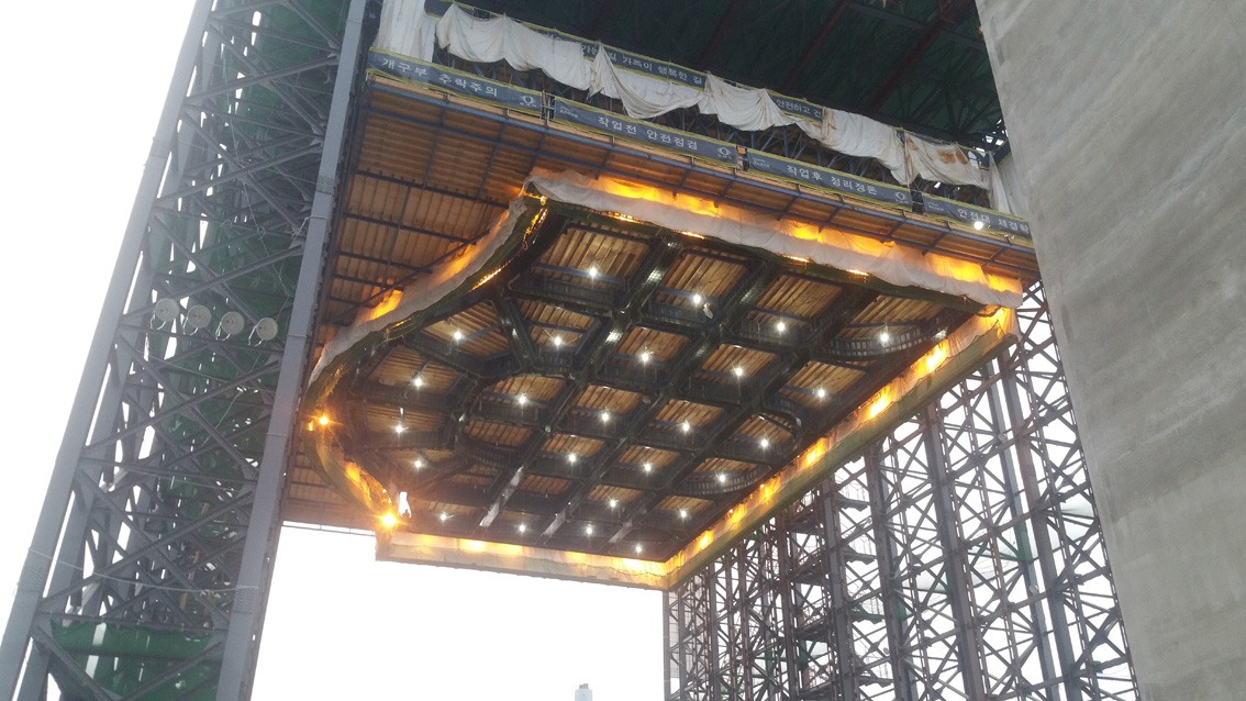 Our breakwall project in Donghae, Korea, is now up and running. The first caisson has been successfully slipformed and transported to the floating dock using our gantry slipform system and transfer equipment.