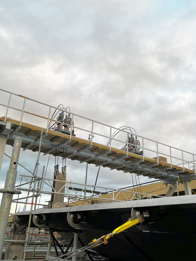 We are proud to get involved in the lowering operation of the first out of two hatchways of 67 tonnes, 38 meters long and 8 meter wide, by using our T-15 strand jack with overload protectors, in groups of four, ensuring the safe lowering operation to the final connection to the hinges in the bottom structure.