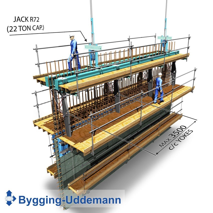 Our Heavy Duty Slipform system is raised using our strongest jack, the R72 (22-ton jack) which can be positioned almost anywhere due to a very strong upper deck structure which support the complete slipform. As the number of jacks are reduced with almost 80% due to the high capacity it will also reduce time required for operation (less adjustments, maintenance, number of hydraulic components, less number of jack tubes to be recovered, etc).