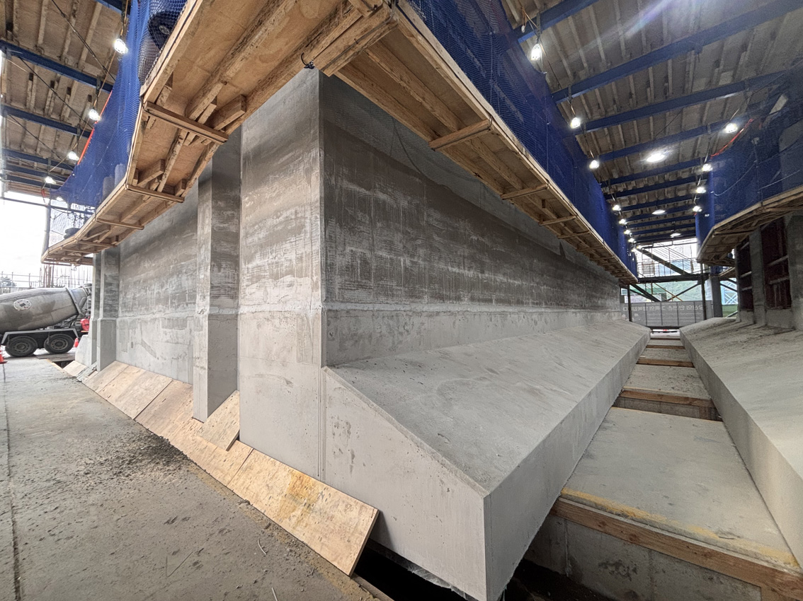 Two caissons are cast simultaneously in the same gantry to increase production efficiency. Once completed, they are transferred individually, using our skidding equipment, to the floating dock for launch.