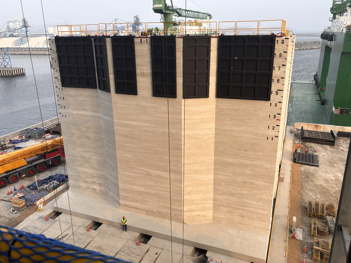 A total of 25 caissons will be slipformed, each measuring 16.3 × 23.9 meters with a height of 19.1 meters and weighing approximately 3,000 tons.