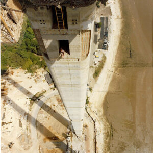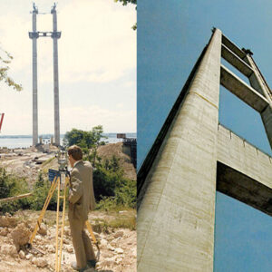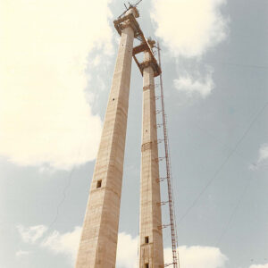 The towers are hollow, 155 metres high each. Measuring 6 m square at the base and tapering to 4.75 × 4.50 m at the top. Wall thickness at the base is 1.50 m